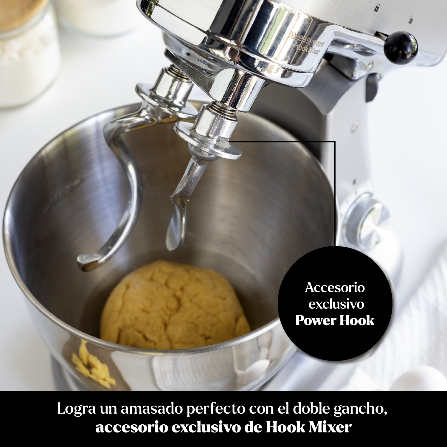Los accesorios que trae Hook Mixer son: Power Hook de Amasado Perfecto, Batidor, Mezclador, Super Mixer y Anti Salpicaduras.