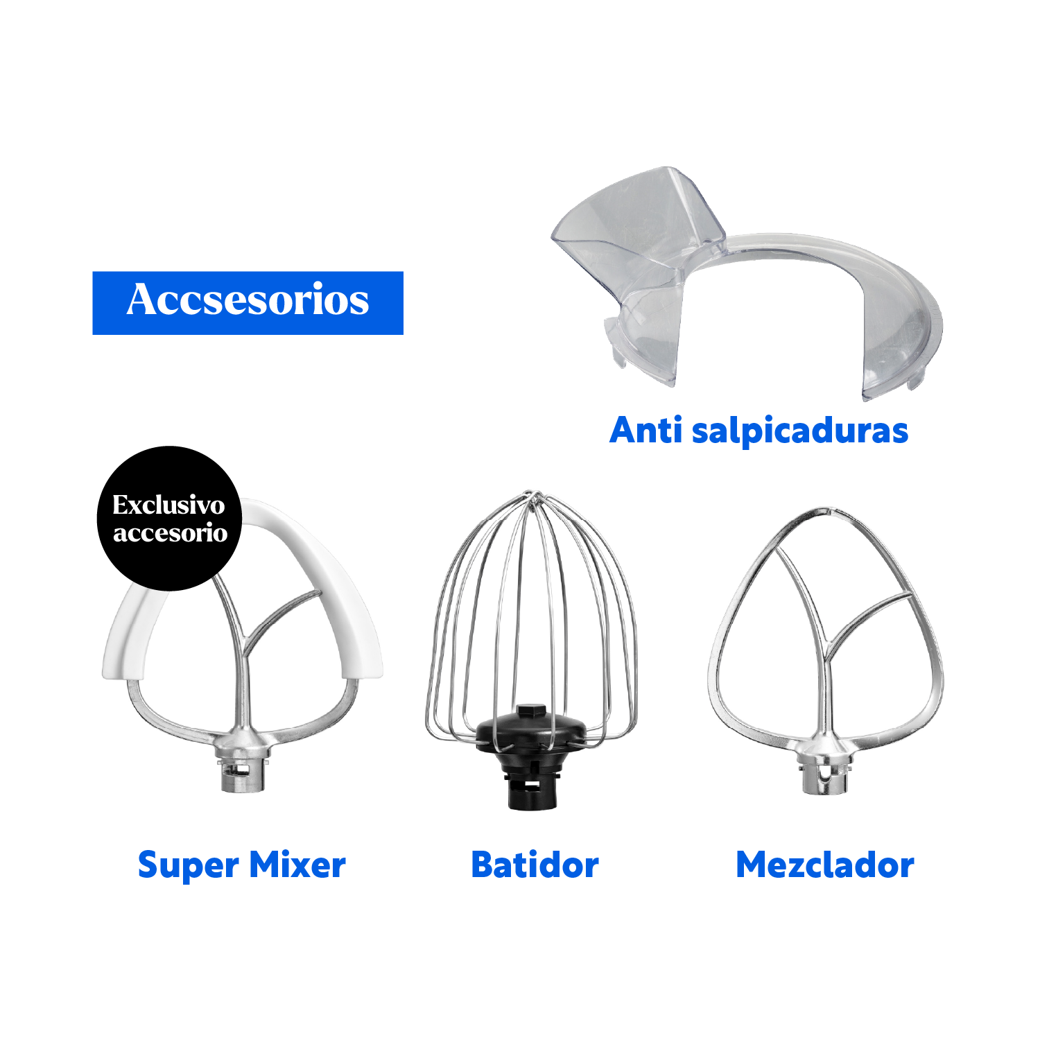| Accesorios | Amasador, Batidor, Supermixer y Anti salpicaduras | Amasador, Batidor, Mezclador y Anti salpicaduras | |