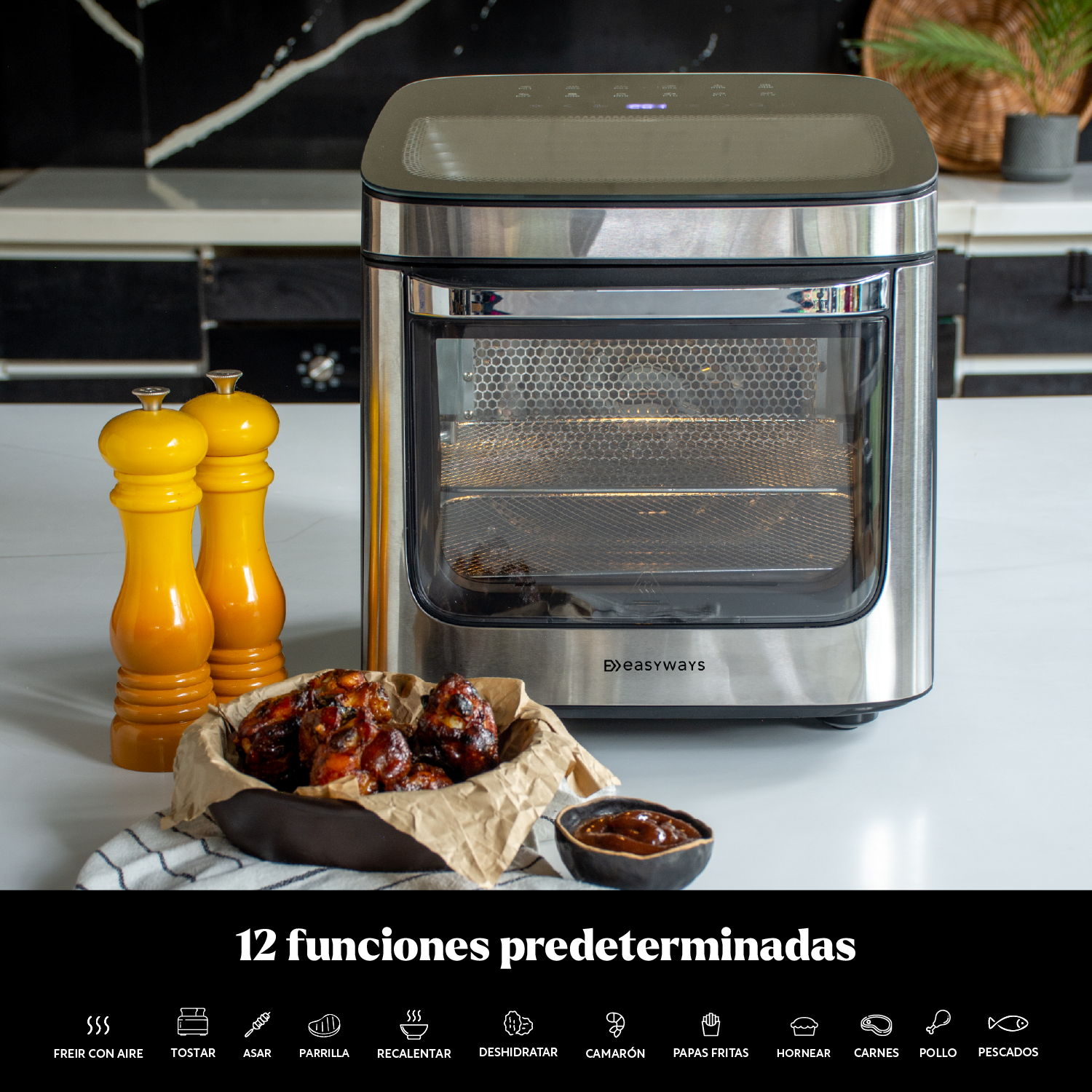 "Con ventana superior y frontal para vigilar la cocción sin abrir la puerta. Innovador sistema de ventilación que asegura horneado y fritura con aire uniformes. 12 funciones automáticas, 4 modos de cocción y 1800 W de potencia para cocinar rápido, saludable y con resultados perfectos. "
