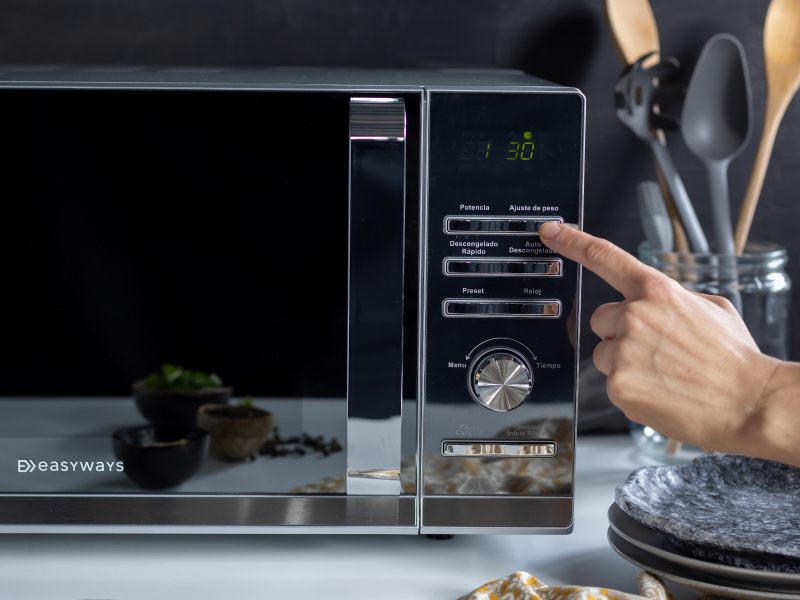 "Potencia y estilo en tu cocina El Microondas EasyWays Max Power 26 L ofrece 1100 W de potencia para un calentamiento rápido y eficiente. Su diseño espejado y moderno lo convierte en el complemento ideal para cualquier cocina."