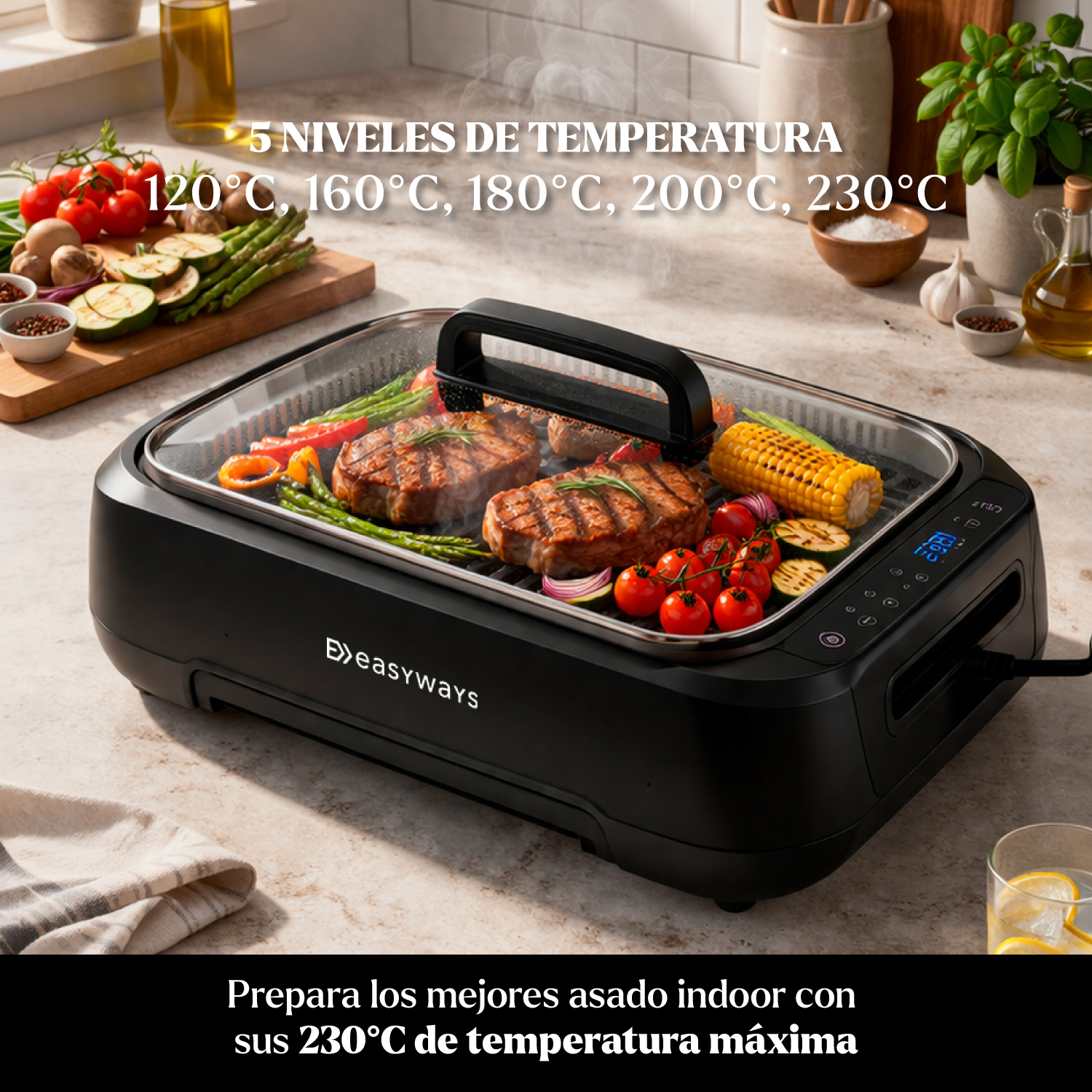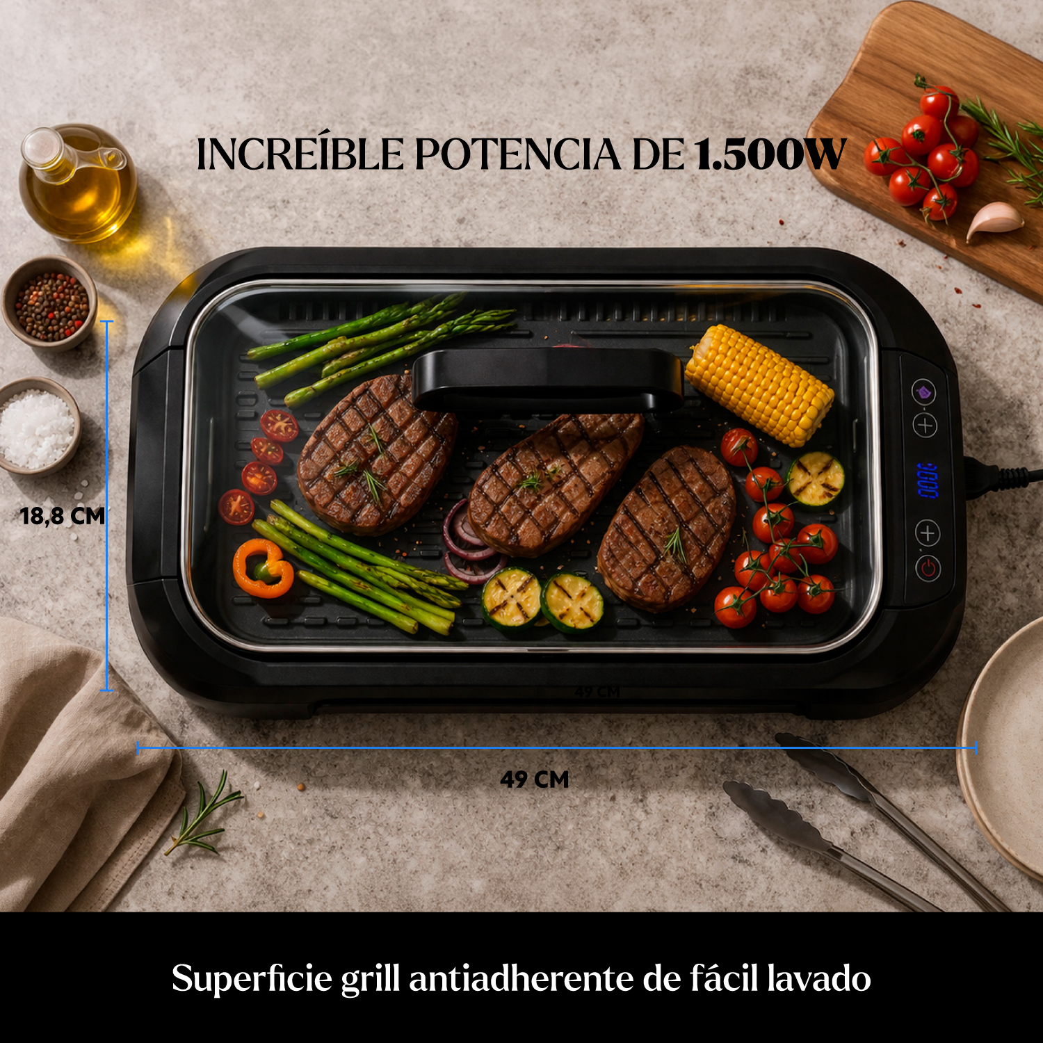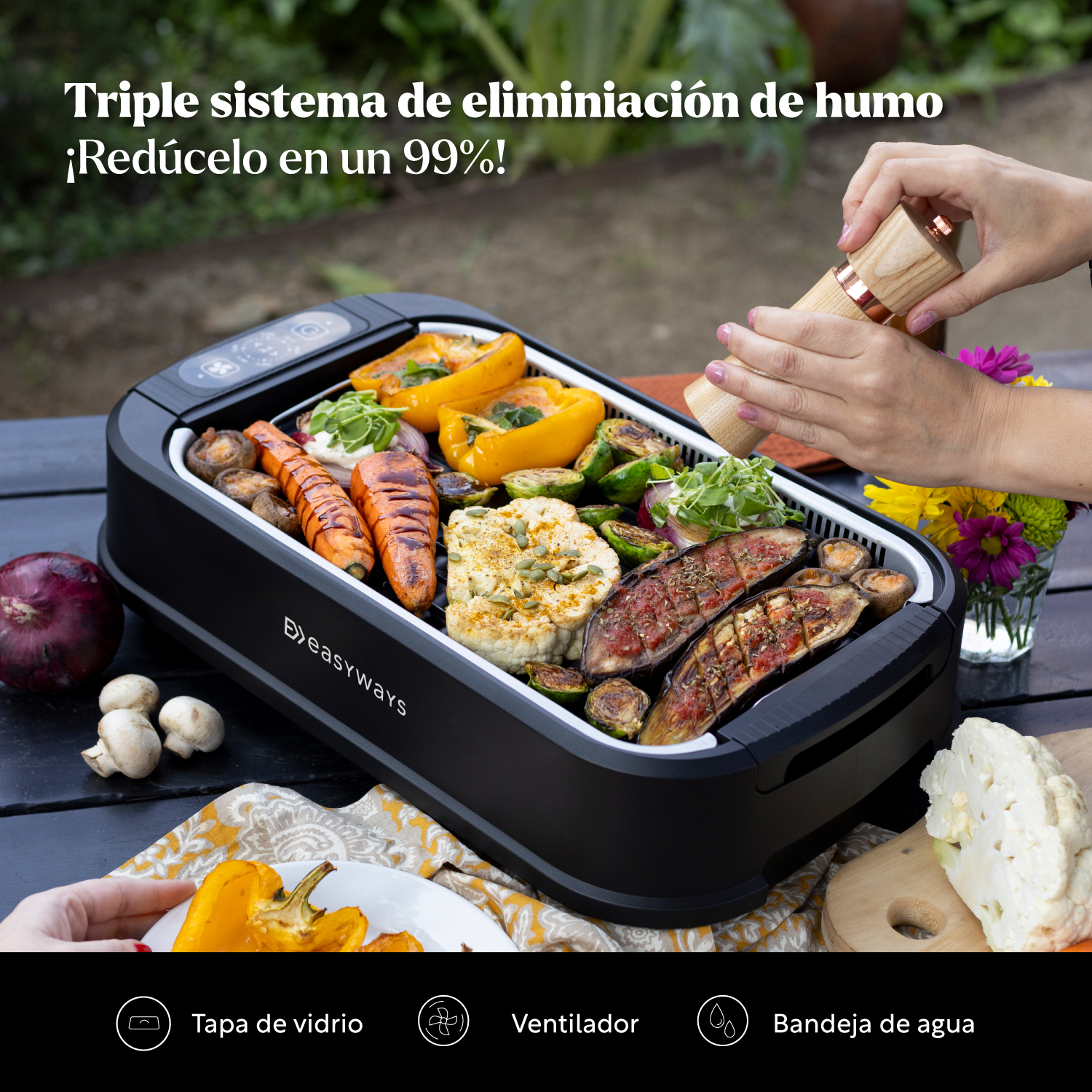 Parrilla eléctrica sin humo, triple sistema minimizador (ventilador, bandeja de agua, tapa de vidrio), amplia superficie, panel intuitivo, fácil limpieza. Cocina sin humo ni olores. Garantía de 1 año