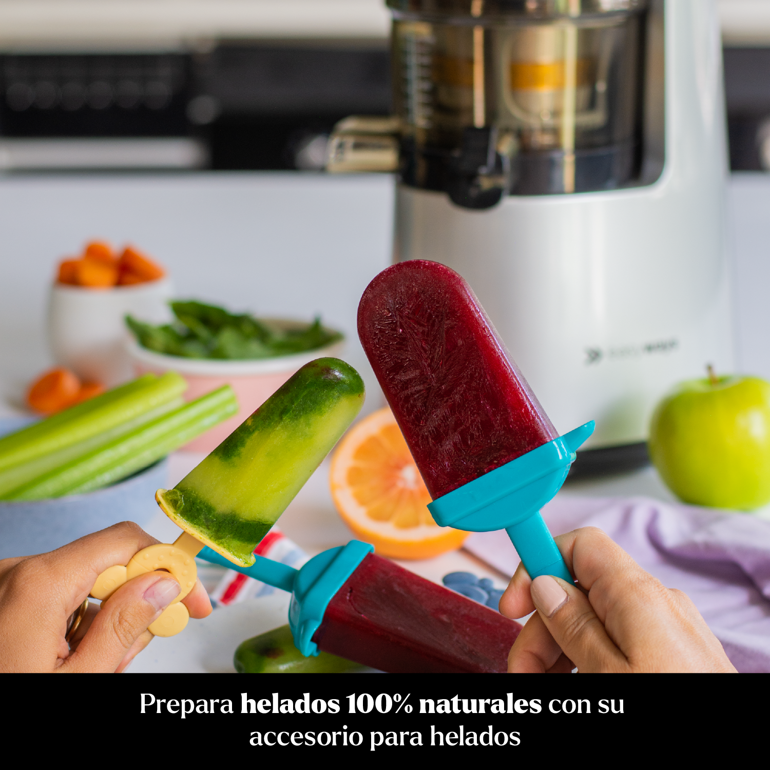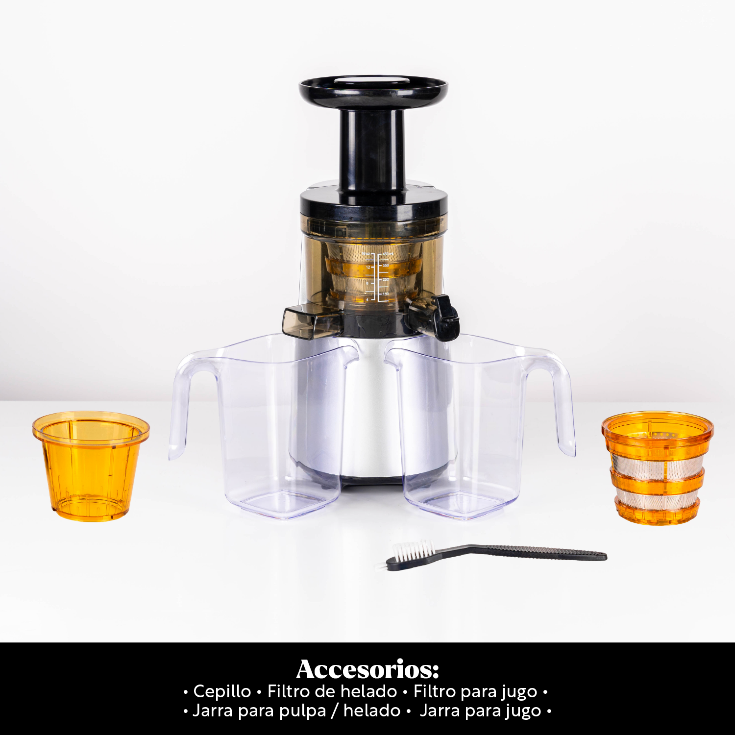 Prensa jugos en frío, conserva nutrientes, recetario chileno gratuito, motor eficiente, fácil limpieza, piezas libres de BPA, filtro para jugos y helados, cepillo de limpieza. Potencia tu salud.