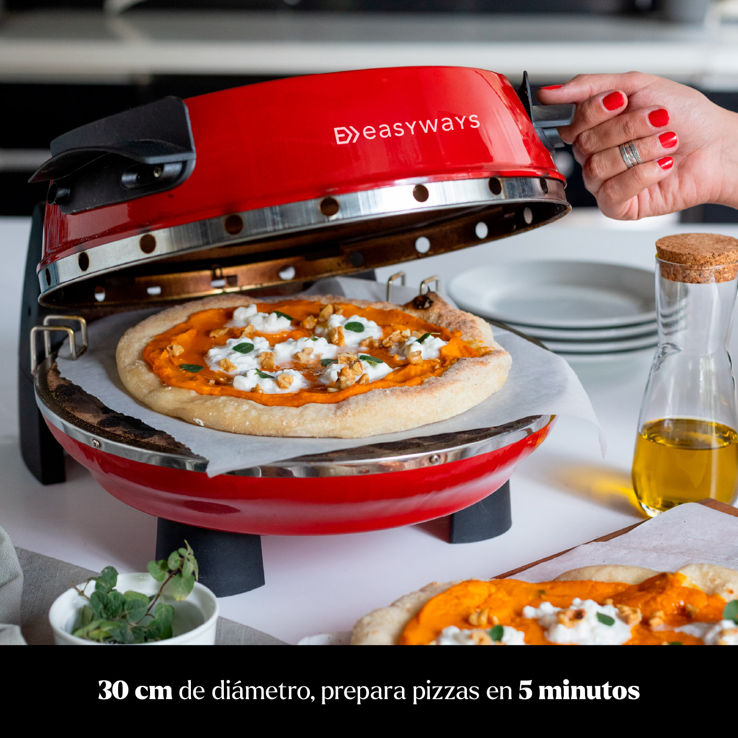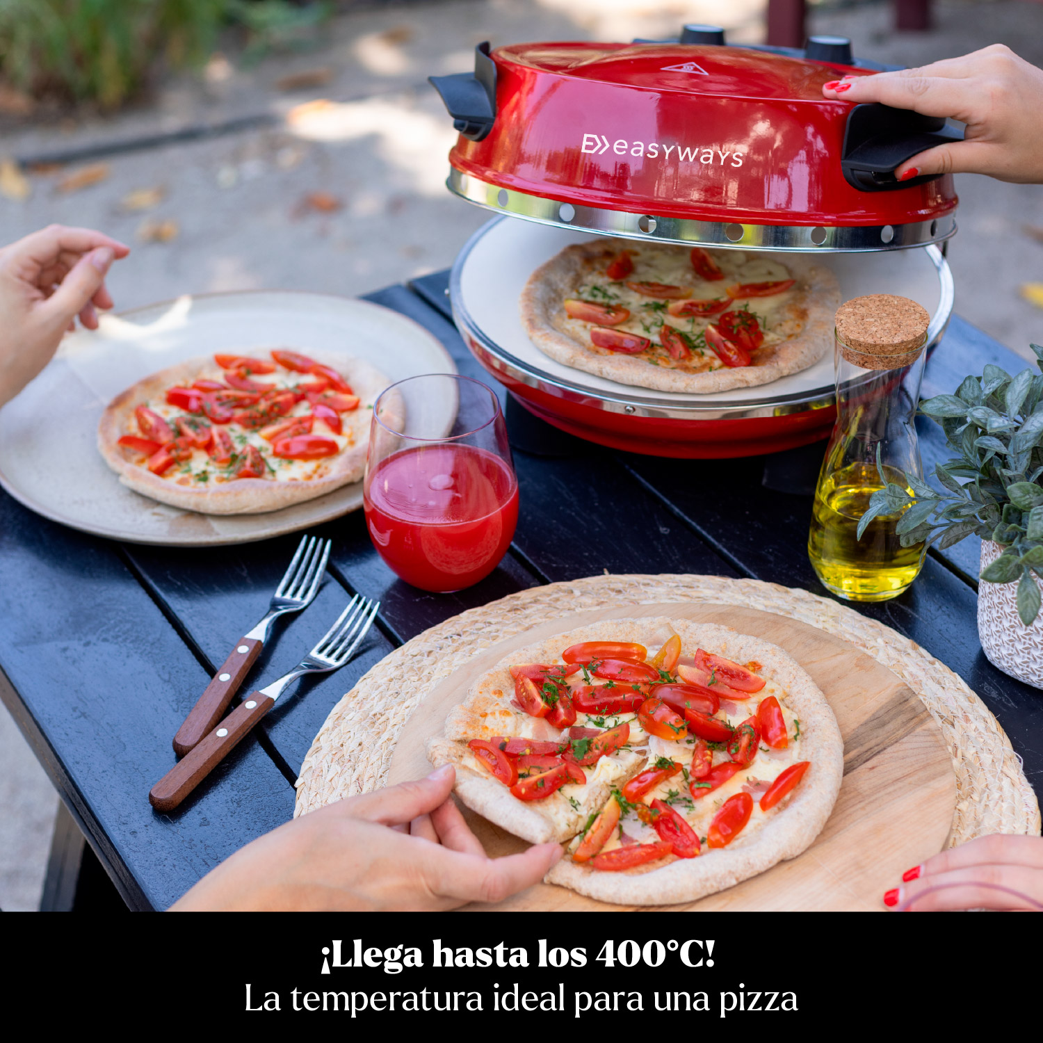 ¡Prepara la auténtica pizza a la piedra de la bella Italia en menos de 5 minutos! El horno de pizza EasyWays alcanza los 400ºC para obtener en menos de 5 minutos la mejor pizza a la piedra hecha en casa.