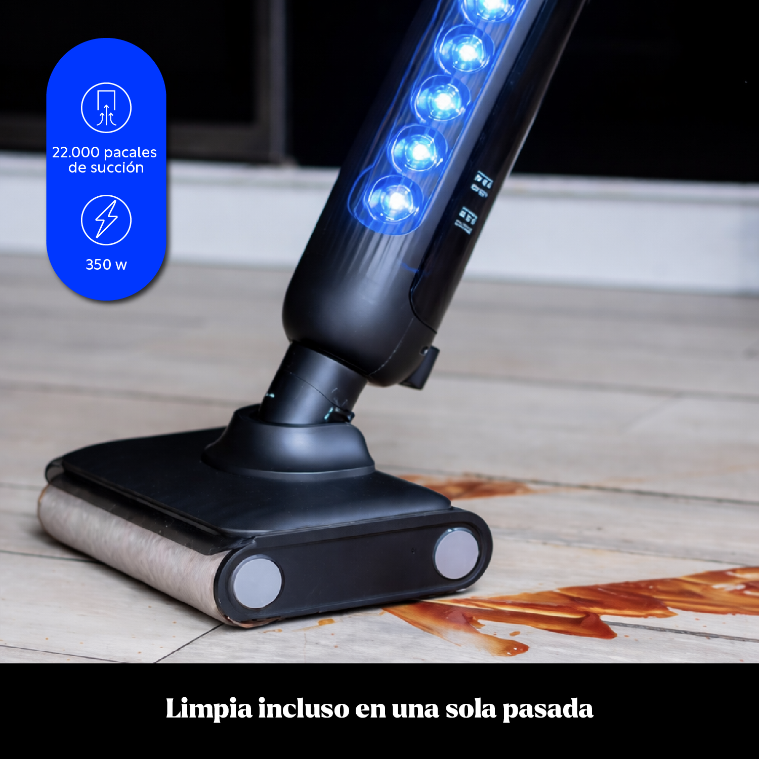 Su gran poder de succión permite recoger polvo, migas y líquidos con facilidad, dejando las superficies limpias y con secado rápido.