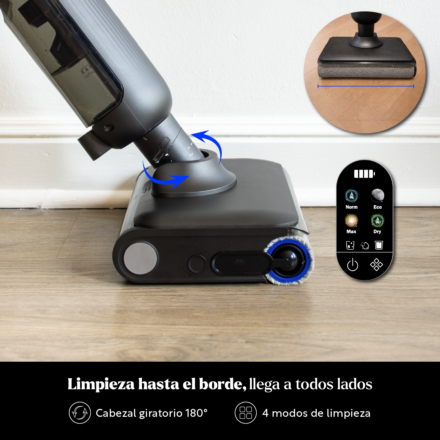 Gracias a su cabezal giratorio en 180° y su sistema de limpieza hasta el borde, llega fácilmente a rincones, bordes y zonas difíciles, incluso debajo de los muebles. Además, su batería de 4000 mAh ofrece hasta 45 minutos de autonomía, ideal para limpiar espacios amplios de hasta 350 m², con un tiempo de carga de solo 3 a 4 horas.