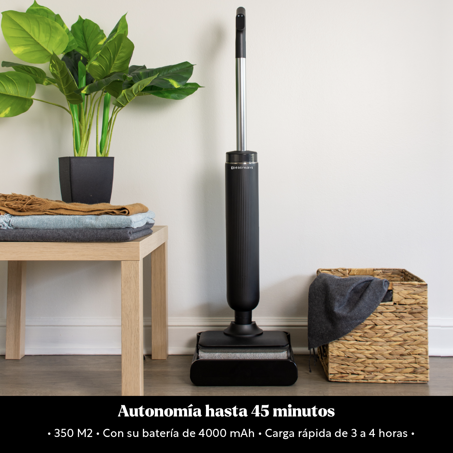 Hasta 45 minutos de autonomía, ideal para limpiar espacios amplios de hasta 350 m².