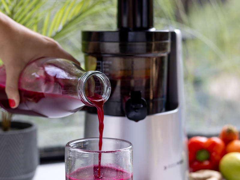 Un Slow Juicer es un prensador de jugos en frío que funciona a bajas revoluciones por minuto, comprimiendo las frutas y verduras gradualmente para evitar que se calienten. Gracias a este proceso se mantienen intactos sus nutrientes sensibles al calor, como las vitaminas A y C, y enzimas vivas. Ésta es una de sus principales diferencias con las licuadoras, que trituran a altas velocidades, con lo que generan fricción y un aumento de temperatura, degradando los nutrientes.